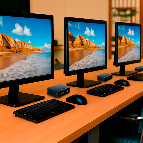Desktops discretos, ideais para mesas de trabalho e ambientes colaborativos. Prontos para Windows, Linux e ambientes virtuais (VDI), com baixo consumo e alta durabilidade.